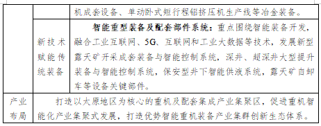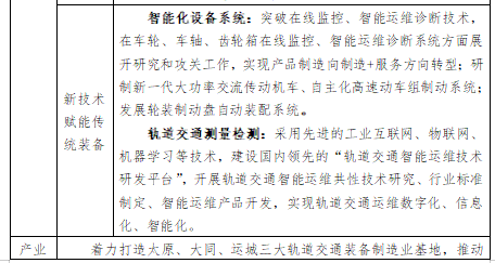 发挥大型骨干企业辐射引领作用,做优做强智能煤机装备、先进轨道交通装备、新能源汽车、电子信息装备等一批具有传统优势和产业基础的产业集群;培育发展新能源装备、智能纺机、通航装备等一批具有良好发展前景的产业集群。着力打造山西新装备“一核三集群三基地”,以山西综改示范区为核心承载,打造轨道交通装备、煤机装备、新能源汽车、通用航空、重型机械为主导的太原产业集群;以大同经济技术开发区为依托,打造轨道交通装备、煤机装备、汽车及零部件、通用航空为主导的大同产业集群;以运城经济技术开发区和高新技术开发区为依托,打造轨道交通装备、汽车、节能环保、农机为主导的产业集群;打造晋中经济技术开发区为依托的晋中新能源汽车、纺织机械、液压机械、铸造产业基地;打造长治高新技术产业开发区和经济技术开发区为依托的长治新能源汽车、电力装备、电子智能装备产业基地;打造晋城经济技术开发区为依托的电子信息装备、煤层气装备、基础工艺装备、铸造、新能源汽车产业基地。