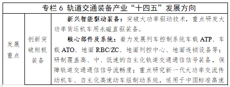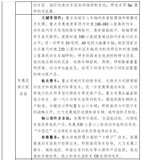 完善轨道交通关键零部件及核心部件配套能力。提升关键零部件研发能力,重点发展车轴、齿轮箱、转向架、轮轴、轮对、牵引电机等关键核心部件,重点研究新一代大功率交流传动机车制动系统;通过引进制动系统和车载、地面信息化设备及系统企业,发展适用于中国标准高速动车组、城际快速动车组的网络控制系统和具有国际先进水平的智能监控系统、电传与电控系统的大技术平台。