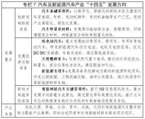 优化关键零部件生产工艺。重点发展新能源汽车电池、电机、电控设备等关键部件,支持以商用车为主的汽车变速箱、电动发动机、车桥、制动装置、发动机外壳、动力总成装置等重点零部件生产企业技术改造,提升自主研发能力,提高产品质量与可靠性;强化发展汽车轻量化材料加工,优化“冶炼—铸造—机加—零部件”产业链。