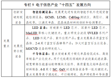 延伸发展半导体装备及下游终端产品。发展红蓝宝石晶体生长装备、平板显示导光板等半导体产品,重点发展砷化镓第二代半导体、碳化硅与氮化镓第三代半导体等产品生产及检测装备,提高半导体工艺及产品良品率。进一步延伸发展智能终端、集成电路、新型显示、智能传感器等电子产品,实现电子信息装备制造业智能化发展。积极引入上游装备制造以及下游器件设计、封装和应用企业,打造国际有影响力的第二代及三代半导体全产业链产业基地。