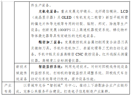 做精做强光机电装备。加强光学镜头、光纤通信、钨钢材料等核心技术攻关,重点发展高速机器视觉系统、锑化物半导体激光器等具有突破性的光机电装备。瞄准技术前沿,开发纳米微晶陶瓷部件、纳米硬质合金刀具等关键部件,提升产业整体配套能力。聚集和孵化一大批光机电大、中、小型科技企业,带动相关上下游产业,打造太原、长治、晋城光机电产业集群。