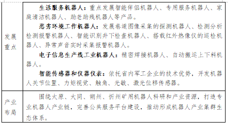 引进培育生活服务机器人。有重点地鼓励发展建筑业机器人、农业机器人、智能伴侣机器人、专用服务机器人、家庭清洁机器人、助老助残机器人等产品。积极引进国内外机器人企业落户,逐步打造链条完整、技术先进、优势突出的机器人产业链。