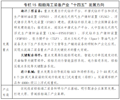 重点培育海工装备与港口机械。依托太重集团滨海海工装备制造基础,以优化结构、技术创新、全链配套为目标,加快推进产品大型化、高端化,重点发展自升式钻井平台、半潜式钻井平台和浮式生产储卸油装置、大吨位龙门起重机等重点装备,整体提升海工装备生产智能化水平,实现主流海工装备重点产品及关键技术重大突破。